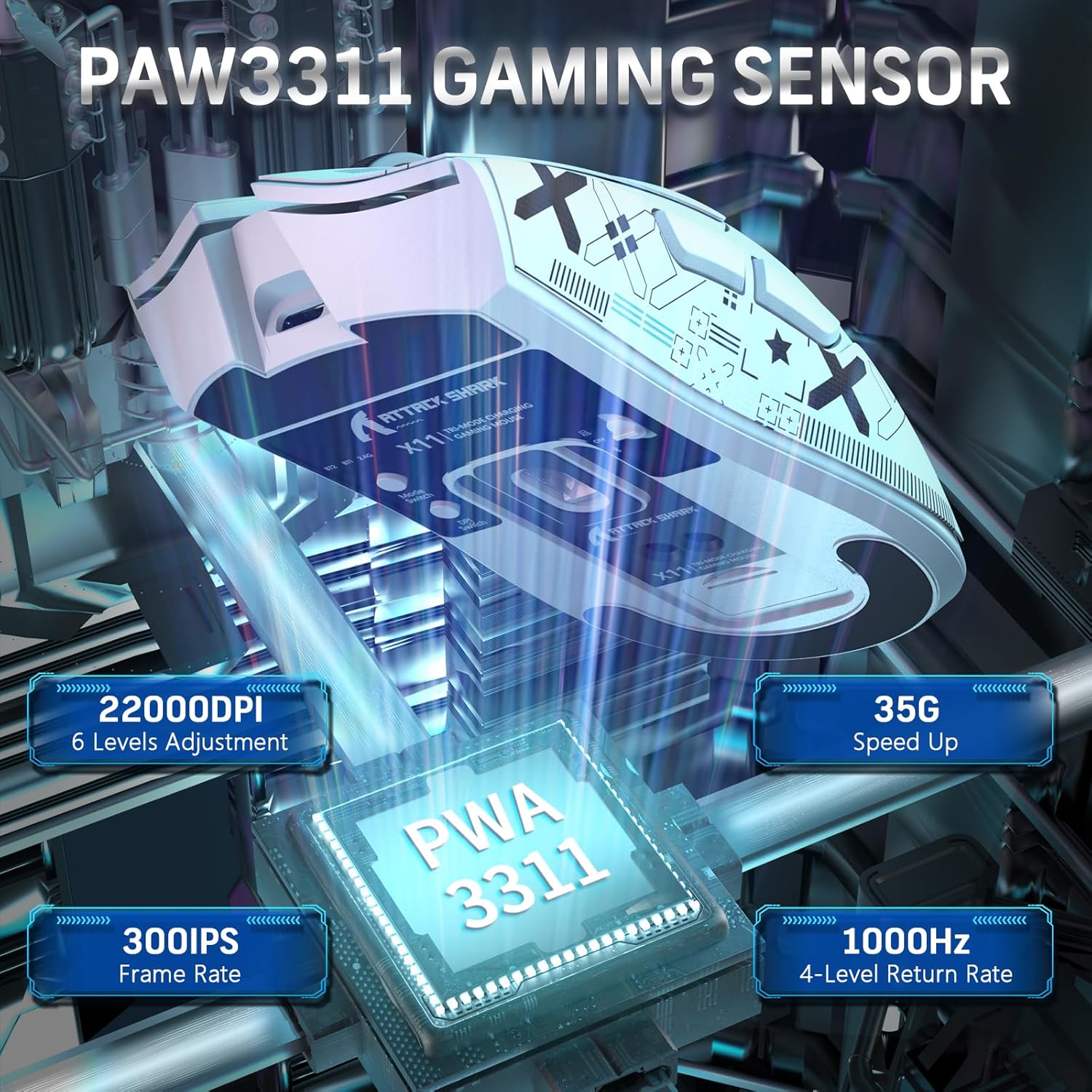 ATTACK SHARK X11 Wireless Gaming Mouse adopts PAW3311 Optical sensor and also has 6 adjustable DPI (800-1600-2400-3200-5000-22000), 300 IPS tracking speed,1000Hz response speed,35G acceleration limit,the special thing is that different DPI values will show different color lights inside the mouse. It can meet the different needs of buyers, especially for office workers who need a lot of clicks or gamers who are looking for precise operation, this mouse can provide excellent using experience.